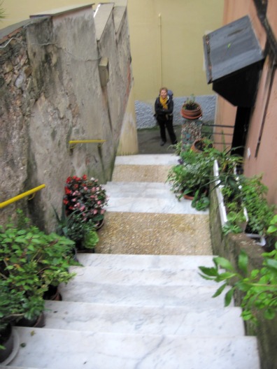 We weren’t prepared for the walk to the hotel. It was a horrendous walk up a steep hill, and then down again. We were with 2 other couples that turned out to be staying at our hotel as well. Once we got there and looked at our map we realized that there was a short cut tunnel at the bottom of the town. Good gosh, what a way to start a day that would be loaded with hills and stairs as it was….I didn’t need any extras to go with it.