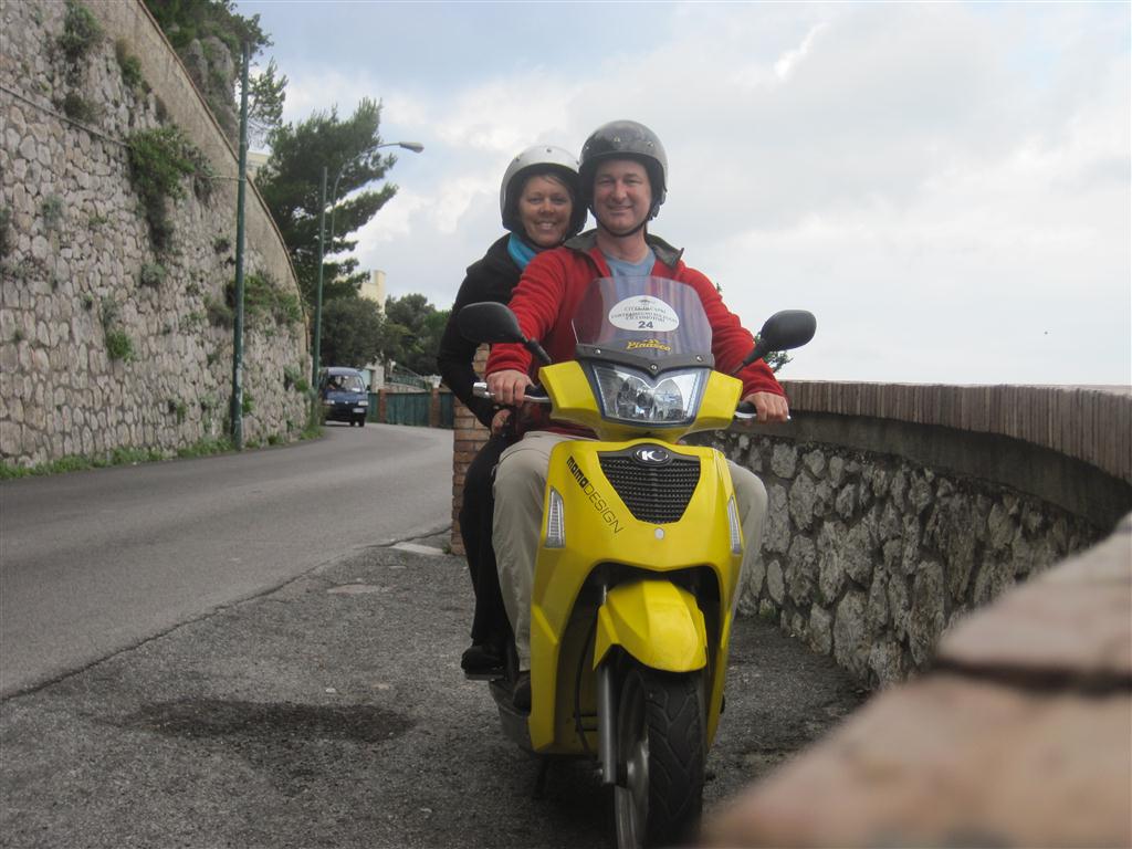 I had a very tough decision to make about whether to drive my own scooter or ride with Rick.  I really wanted to have my own and go along these crazy windy roads, but unfortunately when we got into Capri, I saw the road at the top of the cliff, and just couldn’t fathom driving the road….on a scooter….around a cliff like that.  I was sure I would just panic and drive right off the edge.  So, I was Rick’s pylon.  And let me tell you, we worked that little scooter hard.  Poor thing.  I felt it’s pain trying to get us around the island.