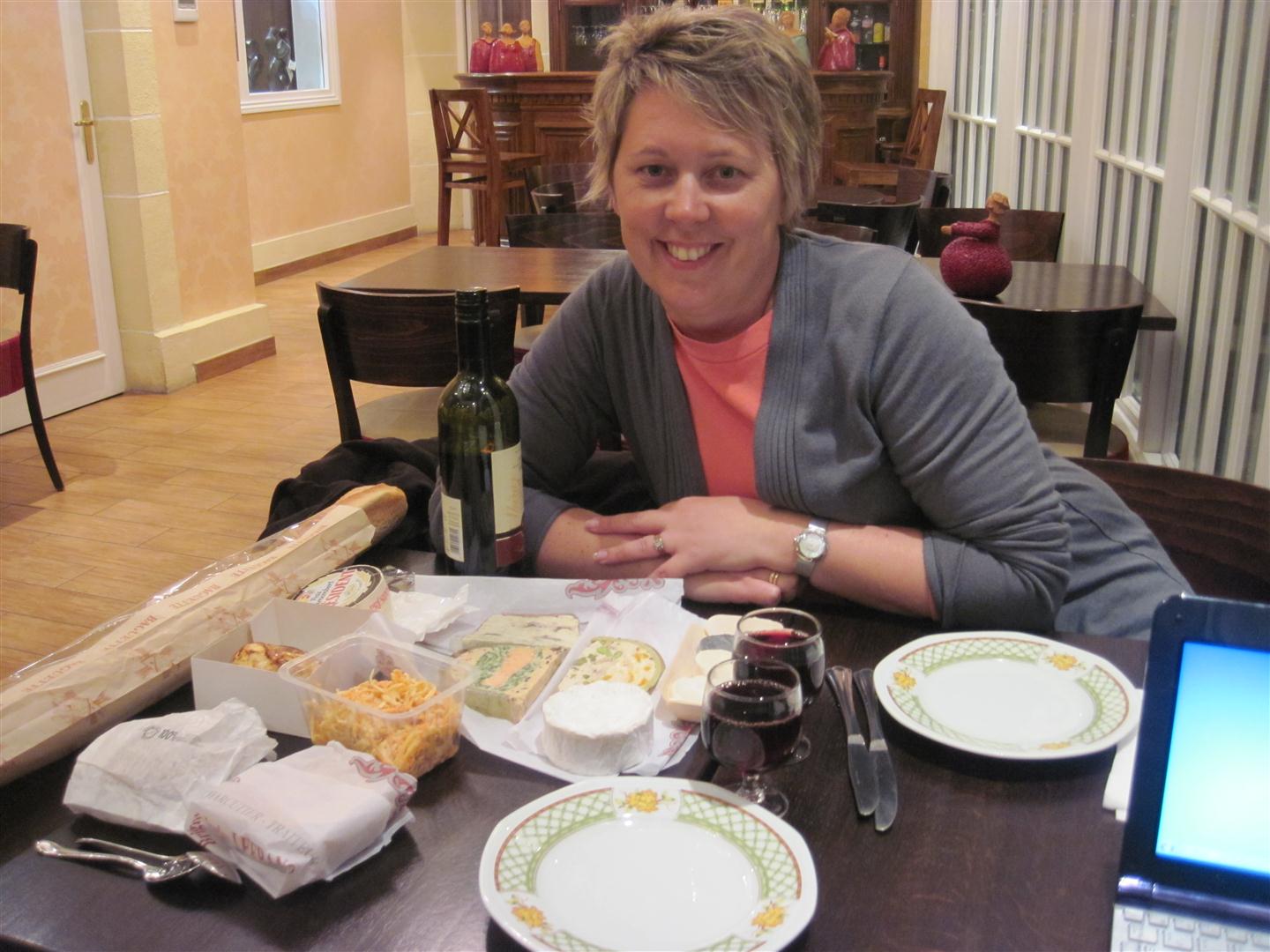 We brought back dinner. We had a 3 different terrines with salmon, haddock, and herring, and also a duck terrine. And of course a baguette with cheese. Delicious.